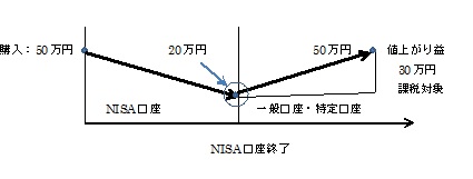 例えば、右の図をご覧ください。売却することができずにNISA口座が終了となりました。一般口座または特定口座に移管された後も持ち続け、ようやく買った価格の50万円に戻り、売却しました。本来は値上がり益はありません。しかし、移管された時点の価格が20万円だったとすると、30万円が値上がり益となり、所得税がかかります。30万円×20.315%=6万945円が税金として引かれてしまうことになります。NISAは、株式等が値上がりして売却することを前提として作られた税制優遇制度です。値下りして口座終了となると、税金が少なくなるどころか、多くなる可能性があります。少なくない投資家が、「非課税制度を利用したために多く税金を取られた」ということになってしまうでしょう。