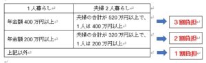 年金額が383万円以上400万円程度の場合は、3割か2割か微妙なところです。年金額200万円前後の場合も、2割か1割か微妙なところです。人によって住民税を計算する控除額が違うからです。あくまで、おおざっぱな目安としてご覧ください。