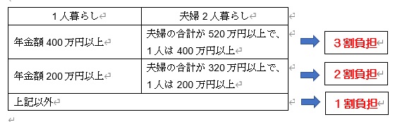 後期高齢者医療保険に加入すると、病院で支払う「窓口負担」は原則として、医療費の1割です。ただ、〝現役並み所得〟がある人は3割です。この10月からは「2割」という区分を設け、一定以上の収入がある人は、1割から2割に引きあがることになりました。以下のように本人または家族と合わせた年収や住民税課税所得で区分されます。